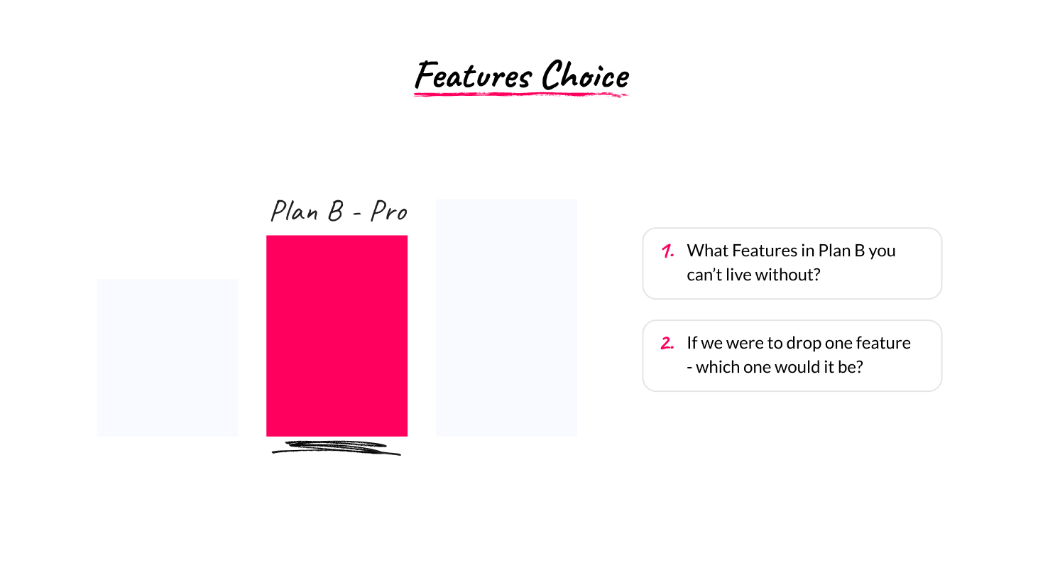 Continuing with the package analysis – we ask about the most and least important features per each plan. This helps us isolate which features drive value the most.